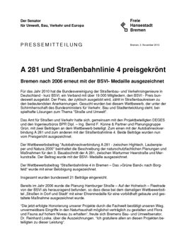 A 281 preisgekrönt Pressemitteilung der Freien Hansestadt Bremen, 03.11.2010 |